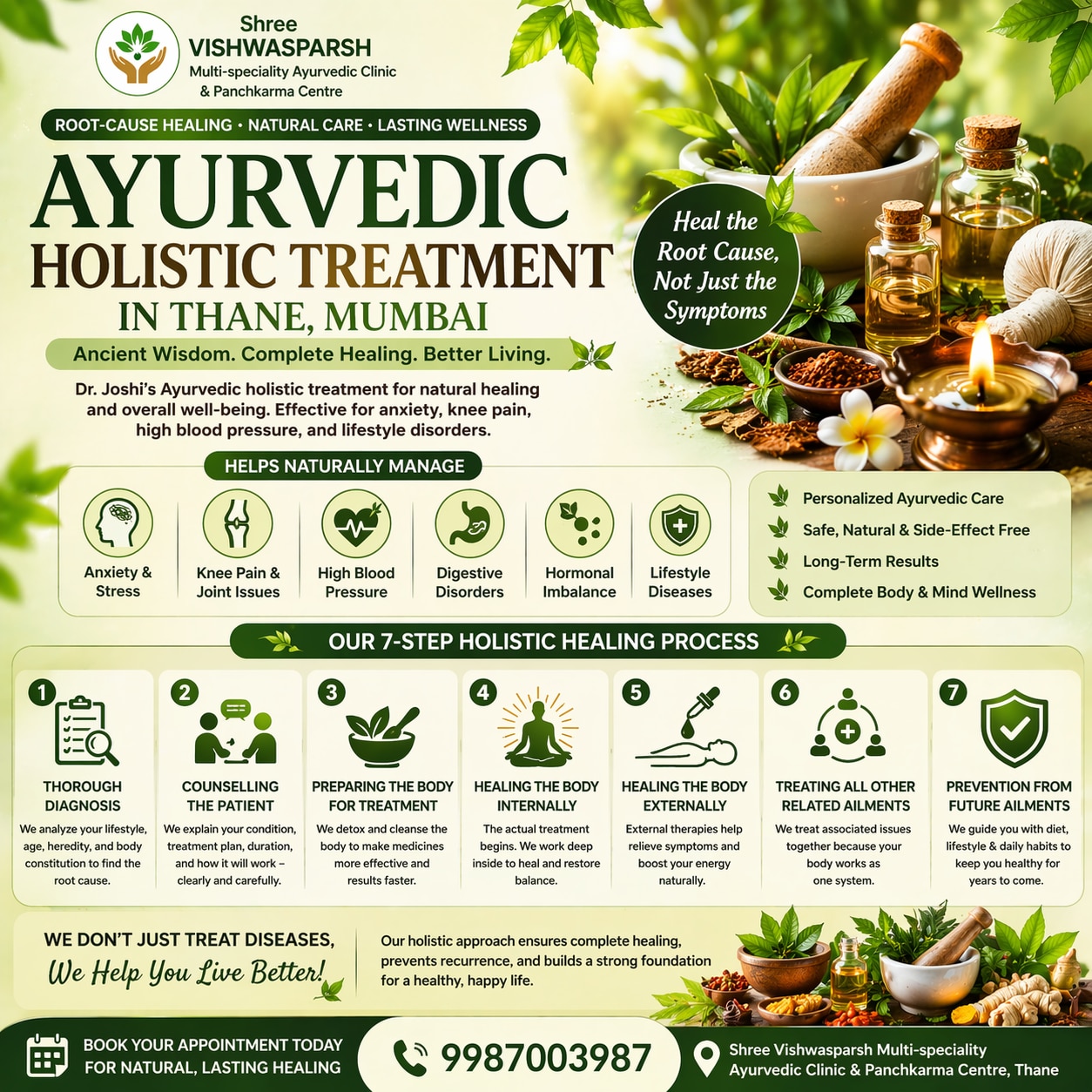 Looking for holistic Ayurvedic treatment in Thane or Mumbai? Dr. Kalpana Vijay Patil (MD Ayurved) at Shree Vishwasparsh Multi-speciality Ayurvedic Clinic and Panchkarma Centre offers complete natural healing solutions focused on treating the root cause of disease, not just symptoms. Our holistic approach combines classical Ayurveda, detox therapies, lifestyle correction, and personalized care to restore balance, improve immunity, and ensure long-term wellness. We provide effective Ayurvedic treatment for: Anxiety & stress management Knee pain & joint disorders High blood pressure (BP) Digestive disorders Hormonal imbalance Lifestyle diseases Why Choose Our Holistic Ayurvedic Treatment in Thane? MD Ayurved expert consultation Root-cause diagnosis (Prakriti-based) Personalized treatment plans Safe & natural therapies Long-term results without side effects Our 7-Step Holistic Healing Process At Shree Vishwasparsh Ayurvedic Clinic, we follow a scientific and structured Ayurvedic approach to deliver the best results: 1. Thorough Diagnosis We analyze your condition deeply by considering lifestyle, diet, age, body constitution (Prakriti), and medical history to identify the root cause. 2. Patient Counselling & Awareness We educate patients about: Their disease condition Duration of treatment Expected results This ensures better understanding and faster recovery. 3. Body Preparation (Detox Phase) Before starting treatment, the body is prepared through internal cleansing and detox therapies to enhance medicine effectiveness. 4. Internal Healing This is the core treatment phase where Ayurvedic therapies work at a cellular level to reverse disease and restore balance. 5. External Healing Along with internal treatment, we use external Ayurvedic therapies to relieve visible symptoms and improve overall energy. 6. Treating Associated Conditions Our holistic approach ensures that all related health issues are treated together, as the body functions as one system. 7. Prevention & Lifestyle Guidance We focus on preventing recurrence by guiding patients with: Diet plans (Ahara) Lifestyle correction (Vihara) Stress management Our Approach to Holistic Healing At our clinic, we don’t just treat diseases—we help you achieve a balanced, healthy, and disease-free life through Ayurveda. We believe: 👉 Healing should be natural, safe, and long-lasting 👉 Every patient needs a personalized treatment approach 👉 Prevention is the key to lifelong wellness Book Your Consultation Today Take the first step towards natural healing with Ayurveda. 📍 Shree Vishwasparsh Multi-speciality Ayurvedic Clinic & Panchkarma Centre, Thane 👩⚕️ Dr. Kalpana Vijay Patil (MD Ayurved)